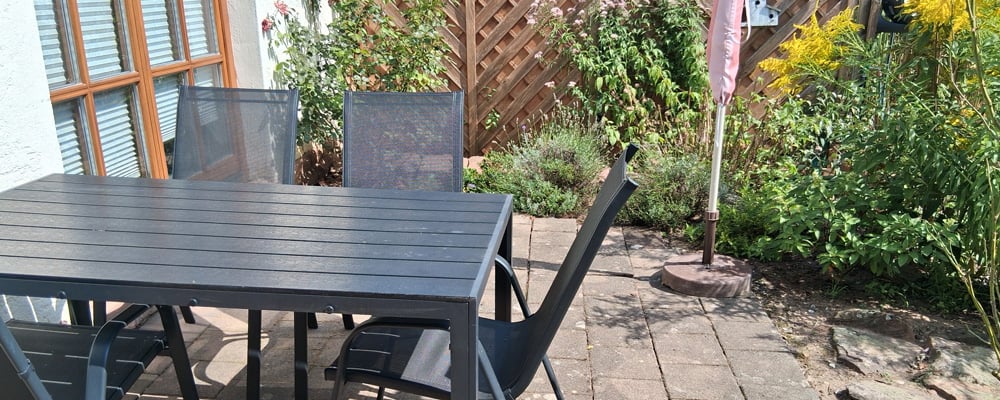 Die Ferienwohnung verfügt über eine eigene separate Terrasse in der Grünanlage im Außenbereich, welche vom Wohnzimmer aus zugänglich ist.